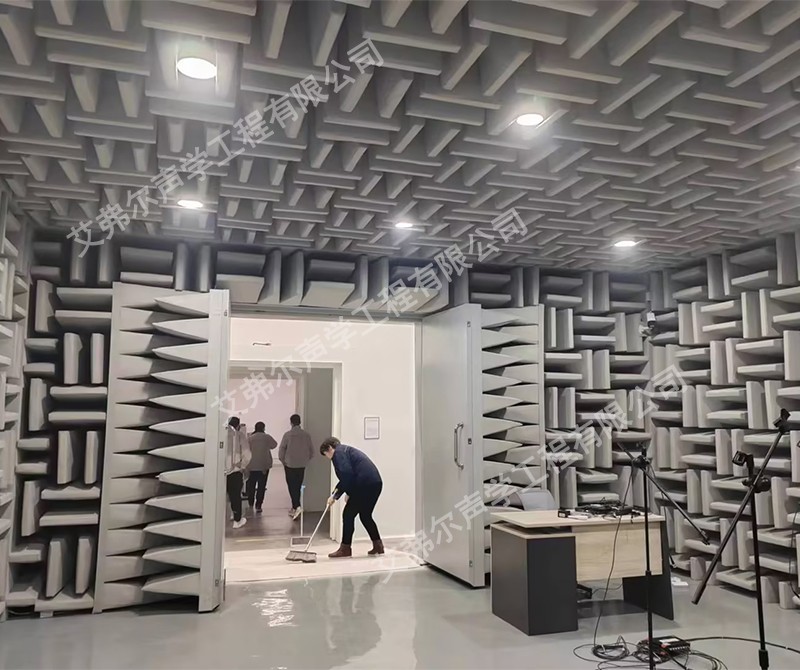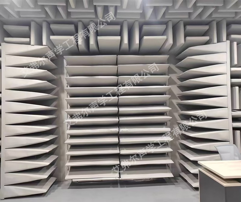 墻壁和天花板:覆蓋高效吸聲材料,如泡沫吸聲板、玻璃纖維吸聲板、吸聲尖劈等,這些材料能夠吸收大部分入射聲波,減少反射。